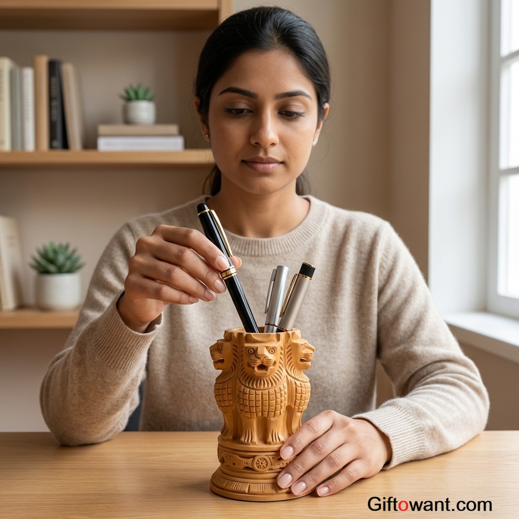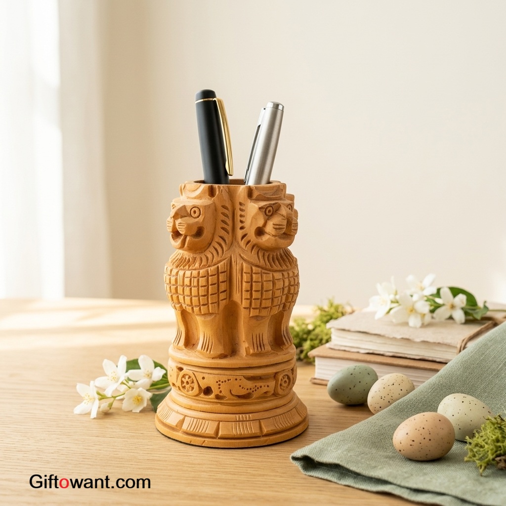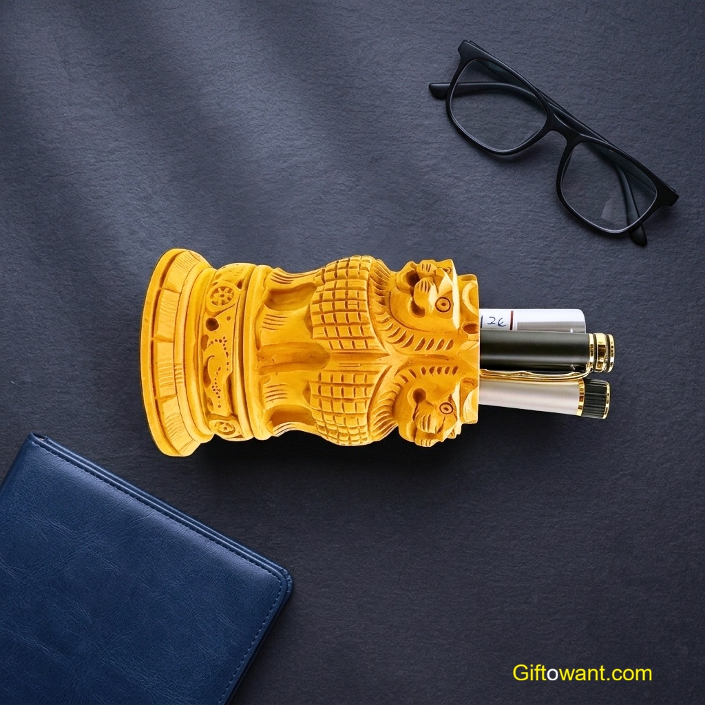 Enhance your desk with the Handcrafted Ashoka Pillar Pen Holder, a symbol of India’s rich legacy. Carved from sustainable wood with iconic lion figures and intricate details, it organizes pens and embodies pride. Perfect for corporate gifts or home décor, its eco-friendly build ensures lasting elegance. Order now on Giftowant.com!
